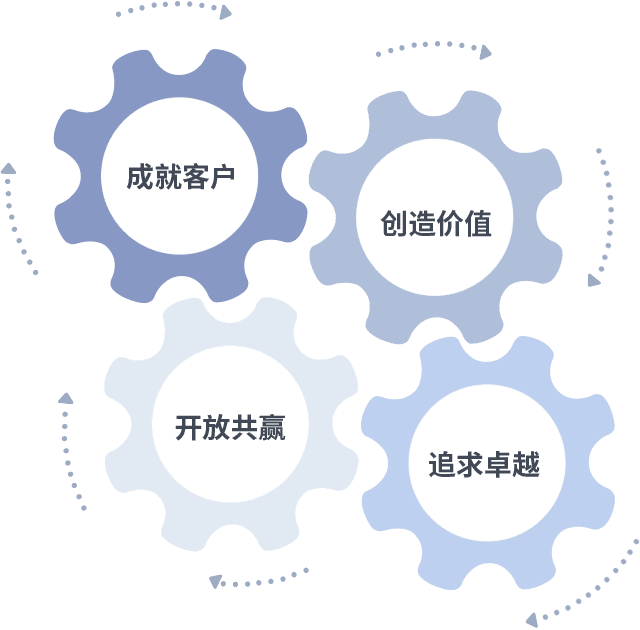 成就客户是一切决策的出发点,,创造价值是衡量所有工作的标准,,,,追求卓越是我们做事做人的态度,,,开放共赢是我们的格局也是最终的结果。。价值观的齿轮环环相扣,,,推动着组织里的每个人不断向前。。。。
