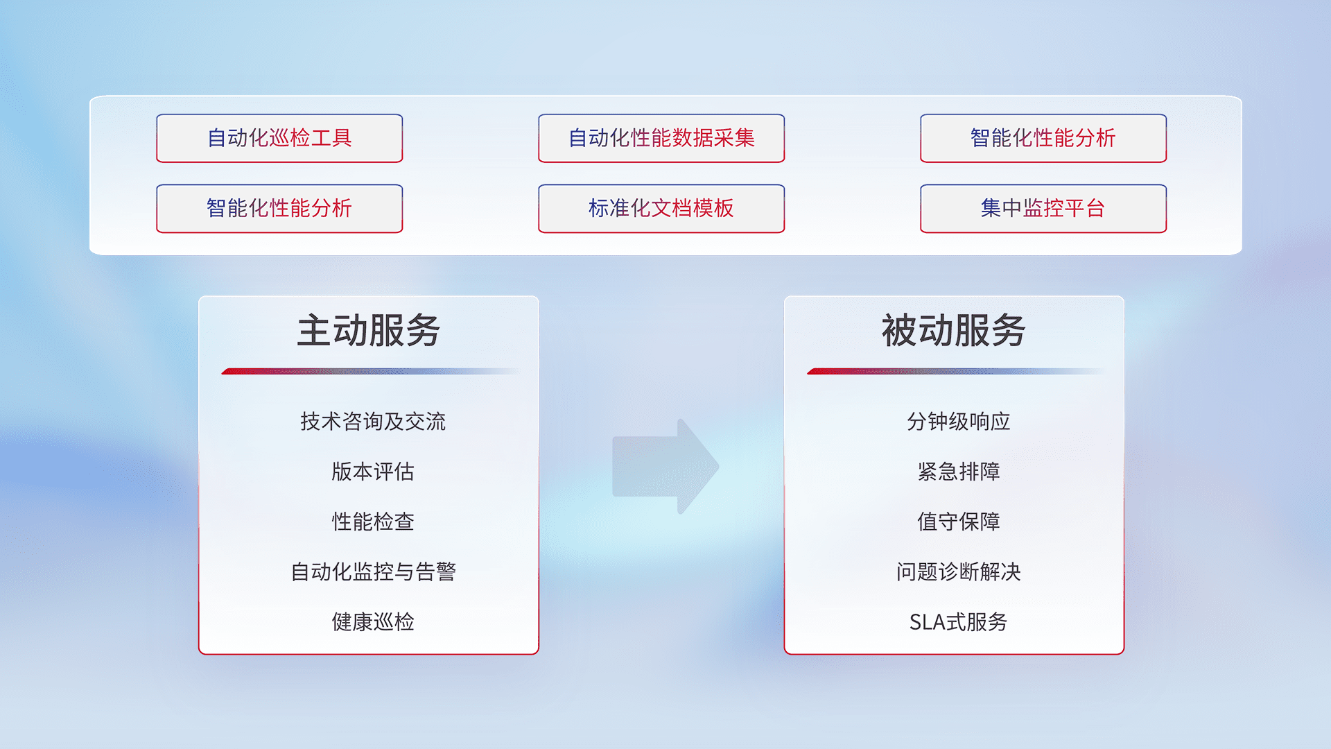 智能化工具和标准化文档,,,保障服务质量,,,,提供主动服务(包含技术咨询、、版本评估、、、、性能检查、、、自动化监控与告警、、、健康巡检)和被动服务包含(分钟级响应、、、、紧急排障、、、、值守保障、、、、问题诊断解决、、SLA服务)。。