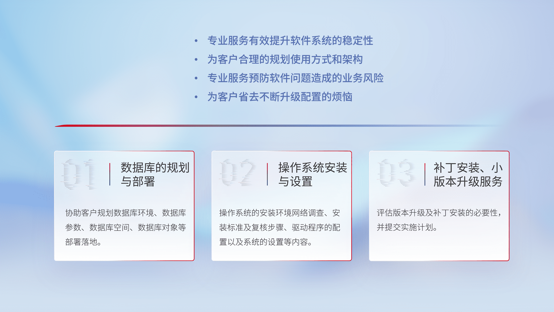 为客户提供软件规模升级、、、快速部署、、、按需配置的专业服务,,从数据库的规划与部署到操作系统的安装与设置,,再到补丁安装和小版本升级提供支持。。。